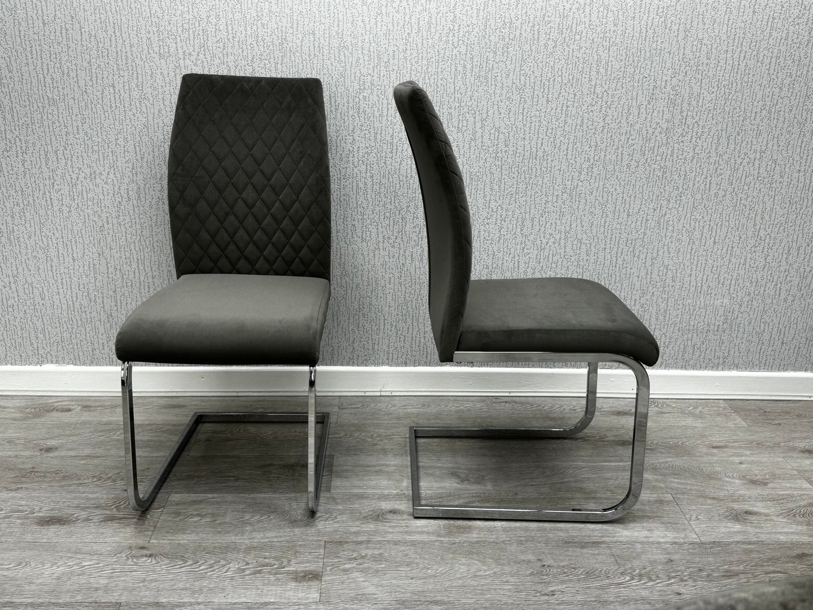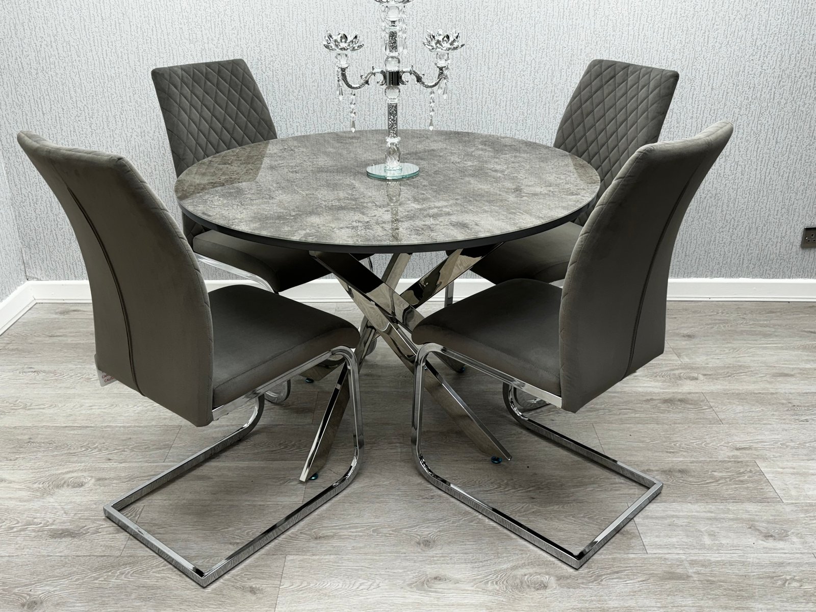 ✅ Includes 4 quilted grey velvet dining chairs