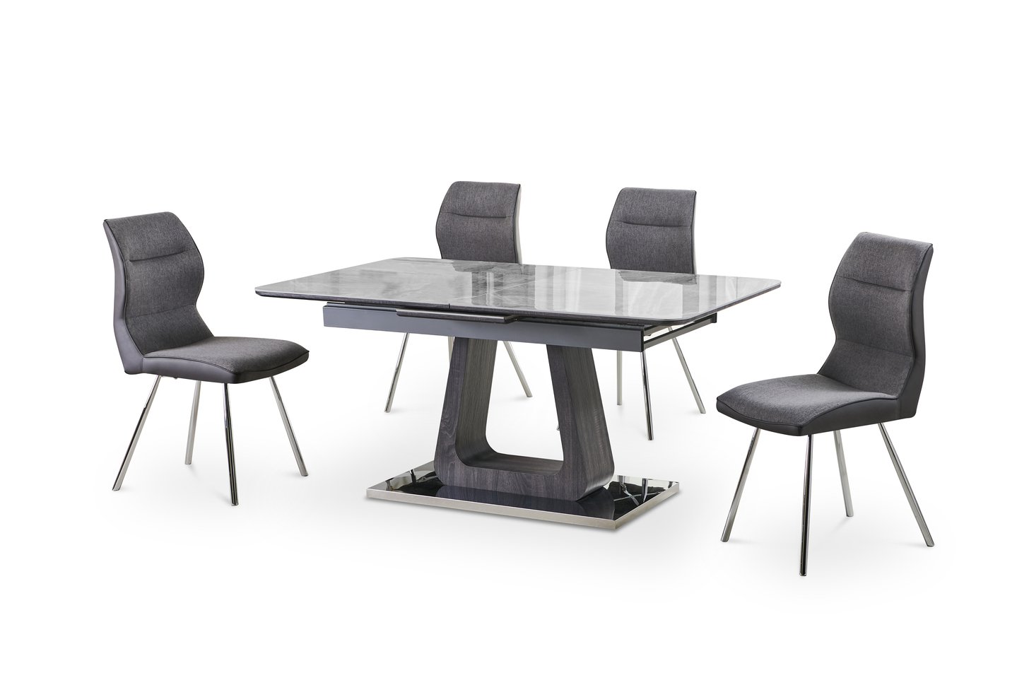 The set is paired with four Zermatt dining chairs, upholstered in a chic blend of grey PU and grey fabric. With cushioned seating and a supportive high backrest, these chairs offer comfort as well as elegance, making them perfect for family dining or entertaining guests.